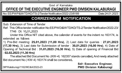 This Office tender notification No:EE/PWD&IWTD/KD/TS-2/Tender Notification/2022-23/7746 Dt: 10,01.2023 Under this Office NIT cited above, the calender of events for the indent no 163174,