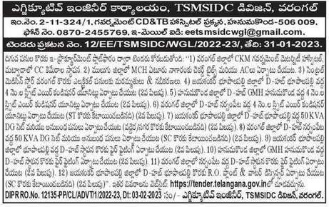 Tender for Office of the Executive Engineer, TSMSIDC Division, Warangal