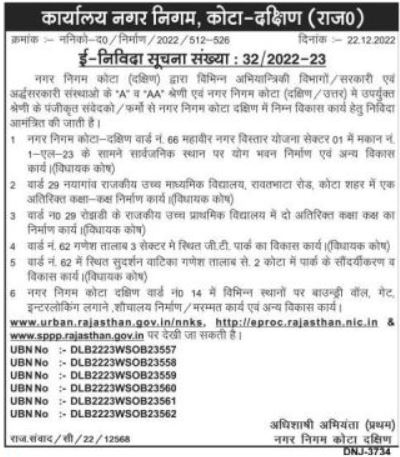 Tender for Office of the Municipal Corporation, Kota-South (Raj.) Number – Naniko D0 / Construction / 2022/512-526 Kota (South) from various engineering departments / government and semi-government organizations in A and AA category and registered contractors / firms of the above category in Municipal Corporation Kota (South / North)