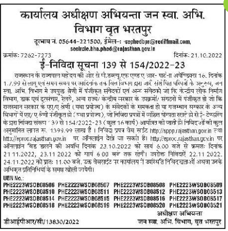 Tender for Office of the Superintending Engineer Public Health. Abhi. Department Circle Bharatpur e-tendering from Nijida No. 39 to 154/2022-23 (Total 16 Tasks) Objections are made.