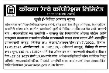 KRCL. By Ratnagiri, open e-tender is invited for the following works. Name of