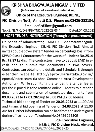 Tender for On behalf of Administrator, CADA.UKP Bheemarayanagudi, the Executive Engineer, KBJNL FIC Division No.3 Almatti invites double cover system tender on percentage basis from KPWD Class-I Contractors for the works of Indent No.2514