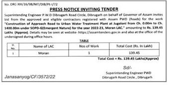 Tender for on behalf of Governor of Assam invites bid from the approved and eligible contractors registered with Assam PWD (Roads) for the work Construction of Approach Road to Urban Water Treatment Plant at Jugeloni from Ch. 0.00 to Ch. 1400.00m under SOPD-G(Emergent Nature) for the year 2022-23, Moran LAC.