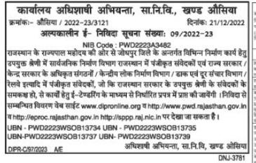 Tender for On behalf of the Governor of Rajasthan, for various construction works under Jodhpur district, the registered contractors in the Public Works Department, Rajasthan and the authorized organizations of the State Government, the Central Government, the registered contractors in the Central Public Works Department, Department of Posts and Telecommunications, Railway