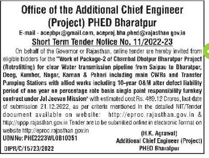Tender for On behalf of the Governor or Rajasthan, online tender are hereby invited from eligible bidders for the “Work of Package-2 of Chambal Dholpur Bharatpur Project