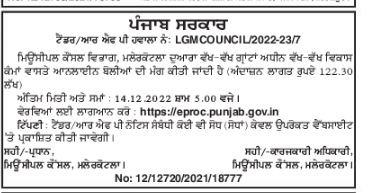 Online bids are invited by Municipal Council Department, Malerkotla for
