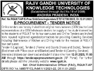 Tender for Online lenders are hereby hviled from original manufacturers (OEM Yauthorized representatives of a CEM/Wholesale dealers for supply at the student amenities 10 the students of RGUKT for its tour campuses and Online Tenders are invited from reputed registered agencies/contractors for provicing Catering Services inclucing Maintenance of Kitchen and Dining Hails for the messes of RGUKT
