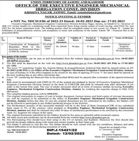 Tender for onstruction of Temporary Boundary Wall in the 2% of the Rs. 200.00 Validity of Rates 90 days Period of completion Position of Funds