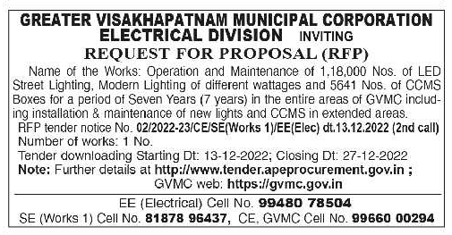 Tender for Operation and Maintenance of 1,18,000 Nos. of LED Street Lighting, Modern Lighting of different wattages and 5641 Nos. of CCMS Boxes for a period of Seven Years (7 years) in the entire areas of GVMC includ- ing installation & maintenance of new lights and CCMS in extended areas.