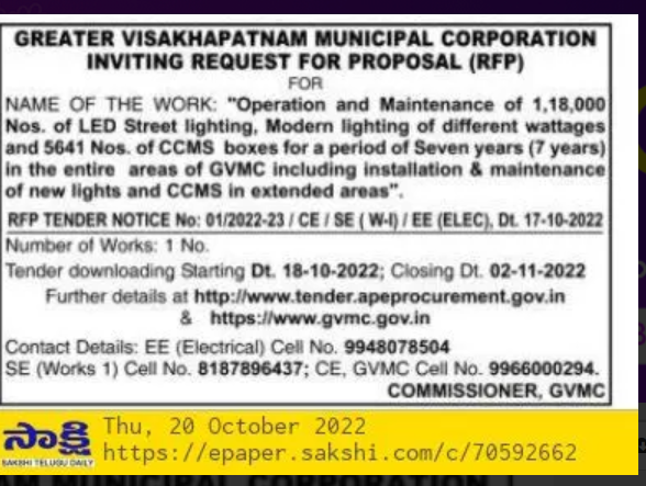 Tender for “Operation and Maintenance of 1,18,000 Nos. of LED Street lighting, Modern lighting of different wattages and 5641 Nos. of CCMS boxes for a period of Seven years (7 years) in the entire areas of GVMC including installation & maintenance of new lights and CCMS in extended areas”.