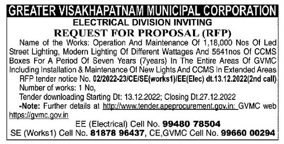 Tender for Operation And Maintenance Of 1,18,000 Nos Of Led Street Lighting, Modern Lighting Of Different Wattages And 5641nos Of CCMS Boxes For A Period Of Seven Years (7years) In The Entire Areas Of GVMC Including Installation & Maintenance Of New Lights And CCMS In Extended Areas