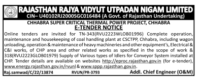 operation, maintenance and housekeeping of coal handling plant at CSCTPP, Chhabra, including wagon unloading, operation & maintenance of heavy machineries and other equipment’s, Electrical & C&I works, of CHP area and other related works as specified in the scope of work & 318(RVU2223GLOB01979) Supply of Various types of Idlers for Conveyor System installed at CHP.