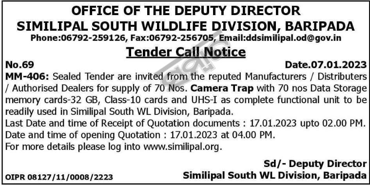 Tender for or supply of 70 Nos. Camera Trap with 70 nos Data Storage memory cards-32 GB, Class-10 cards and UHS-I as complete functional unit to be readily used in Similipal South WL Division