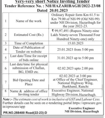 Tender for Ordinary Repair form Km 61.5 to Km 79.00 of NH-99 (Old NH-99) under NH Division, Hazaribagh for the year 2022-23.