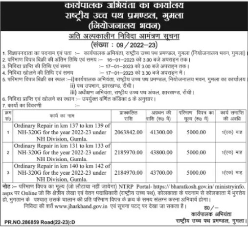 Tender for Ordinary Repair in km 140 to km 142 of 3 NH-320G for the year 2022-23 under NH Division, Gumla.
