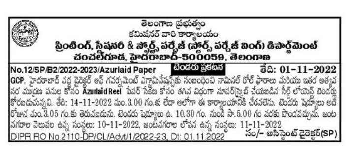 Tender for other high quality printing works in connection with Director of Government Examinations at GCP, Hyderabad.