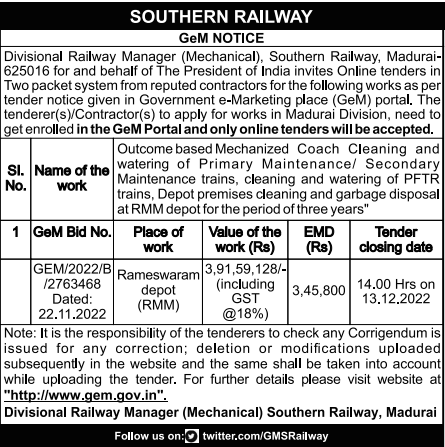 Outcome-based Mechanized Coach Cleaning and watering of Primary Maintenance/ Secondary Maintenance trains, cleaning and watering of PFTR trains, Depot premises cleaning and garbage disposal at RMM depot for the period of three years”