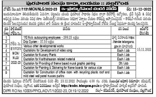 Tender for outsourced employees, drip system & various development works and various types of materials/equipment through Municipal General Funds in the City