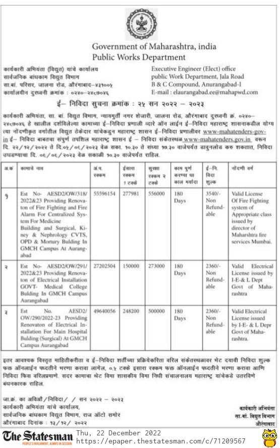 Tender for OW/290/2022-23 Providing Renovaton of Electrical In- stallation For Main Hospital Bulding (Surgical) At GMCH Campus Aurangabad