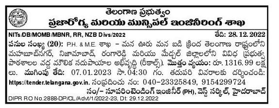 P.H. & M.E. Development of Infrastructure (Recalls) at various Government Schools in Telangana State – Mahbubnagar, Nizamabad, Rangareddy and Medchal Districts under Mana Uru Mana Badi – Mana Uru Mana Badi.