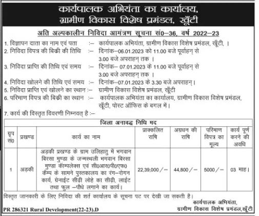 Tender for Painting work of library in front of Bhagwan Birsa Munda Complex and CRPF Camp, birth place of Bhagwan Birsa Munda in village Ulihatu of Adki block, work of granite staircase, iron staircase, lights and planting of flowers.