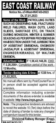 PATROLLING DUTIES SUCH AS OBSERVING RAIL FRACTURES/ WELD FAILURES, WASH OUTS, LAND SLIDES, SABOTAGE ETC. ON TRACK DURING MONSOON, WINTER & SUMMER SEASONS AS PERIRPWM PROVISIONS IN KK-I SECTION UNDER THE JURISDICTION OF ASSISTANT DIVISIONAL ENGINEER/ JAGDALPUR & ASSISTANT DIVISIONAL ENGINEER/KIRANDUL OF WALTAIR DIVISION.