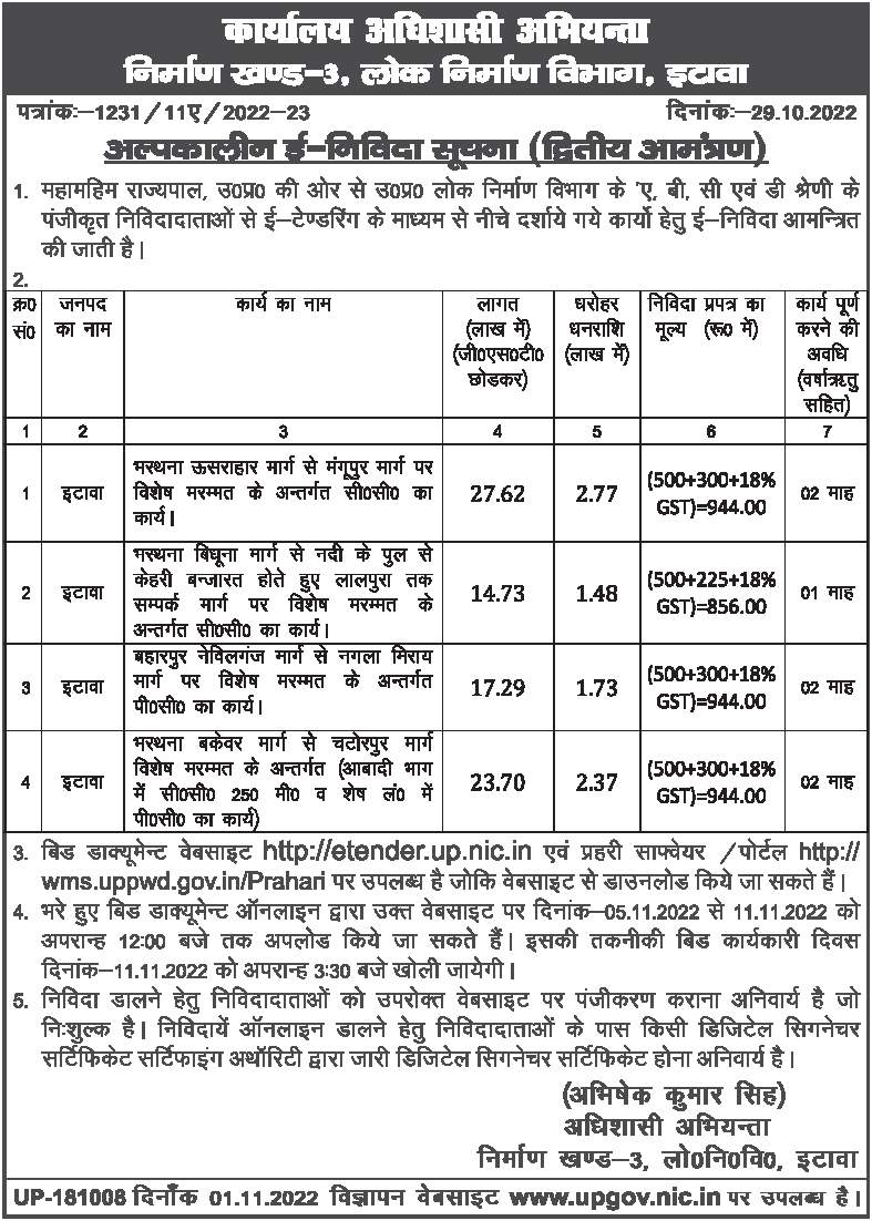 Tender for PC work under special repair from Baharpur Nevilleganj road to Nagla Mirai road.