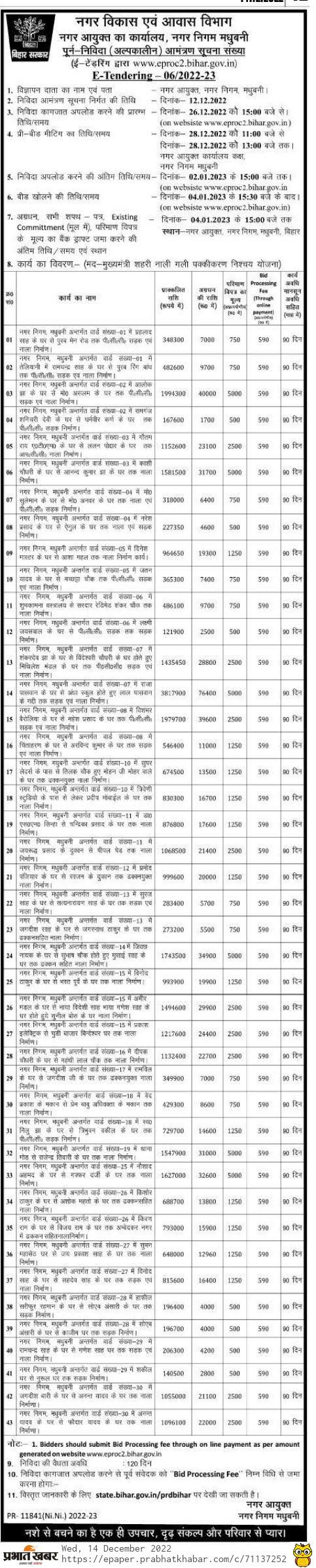 Tender for PCC [Road Construction from late Nilu Jha’s house to Tribhuvan Vakil’s house in Ward No. 18 under Municipal Corporation, Madhubani.