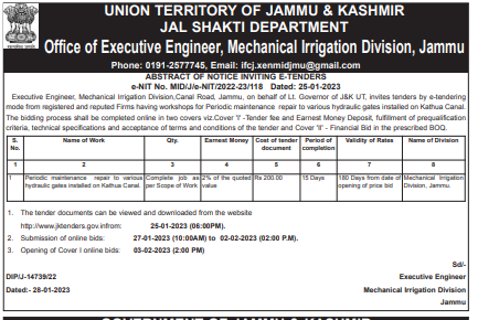 Tender for Periodic maintenance repair to various hydraulic gates installed on Kathua Canal