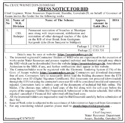 Tender for Permanent restoration of breaches at Shantipur area along with improvement, stabilization and restoration of other damaged reaches of the dyke on the R/B of river Borak