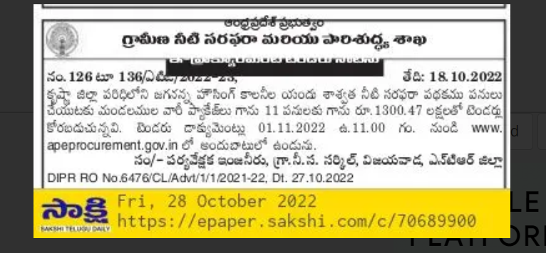 Tender for Permanent water supply scheme works in Jagananna housing colonies in Krishna district