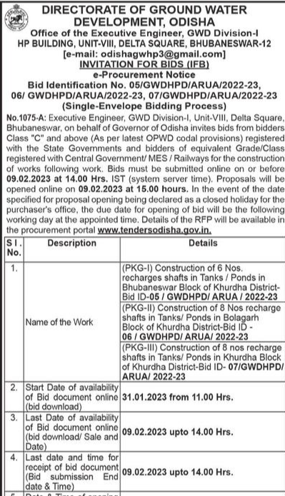 Tender for (PKG-1) Construction of 6 Nos. recharges shafts in Tanks/Ponds in Bhubaneswar Block of Khurdha District- Bid ID-05/GWDHPD/ARUA/2022-23