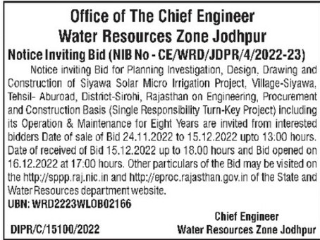 Tender for Planning Investigation, Design, Drawing and Construction of Siyawa Solar Micro Irrigation Project,