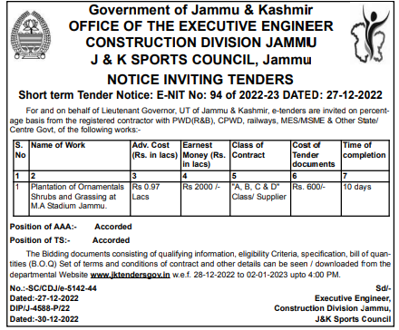 Tender for Plantation of Ornamentals Shrubs and Grassing at M.A Stadium Jammu.