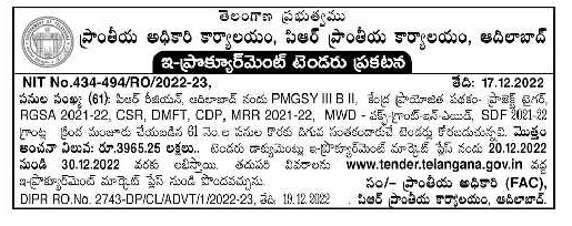 Tender for PMGSY IIIB in PR Region, Adilabad Centrally Sponsored Scheme- Project Tiger, GUSA 2021-22. CSR, DMFT, COP, MRR 2021-22, MWD – Pux Grant in Aid, SDF 2021-22 A Grants sanctioned