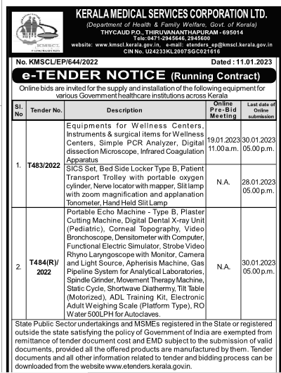 Portable Echo Machine – Type B, Plaster Cutting Machine, Digital Dental X-ray Unit (Pediatric), Corneal Topography, Video Bronchoscope, Densitometer with Computer, Functional Electric Simulator, Strobe Video Rhyno Laryngoscope with Monitor, Camera and Light Source, Apherisis Machine, Gas Pipeline System for Analytical Laboratories, Spindle Grinder, Movement Therapy Machine, Static Cycle, Shortwave Diathermy, Tilt Table (Motorized), ADL Training Kit, Electronic Adult Weighing Scale (Platform Type), RO Water 500LPH for Autoclaves.