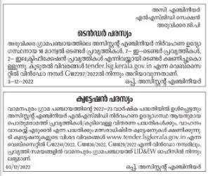 Tender for Pothanath Works as Assistant Engineer LCD Executive Officer shows competitive tenders for drinking water supply projects and vehicle leasing projects