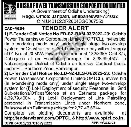 Tender for Power Transmission Corporation Limited(OPTCL), invites bid (In e-tendering mode only) under single stage two-envelop system for (1) Lot-I Deployment of security Personnel in Grid Sub-stations/Offices/Stores