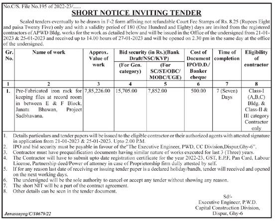 Tender for Pre-Fabricated iron rack for keeping files at record room in between E & F Block. Janata Bhawan, Project Sadbhavana.