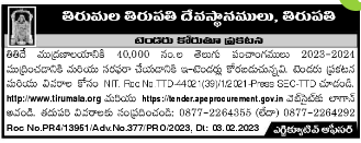 Tender for printing and supply of 40,000 years of Telugu Panchangams 2023 2024 to Thithide Printing House.
