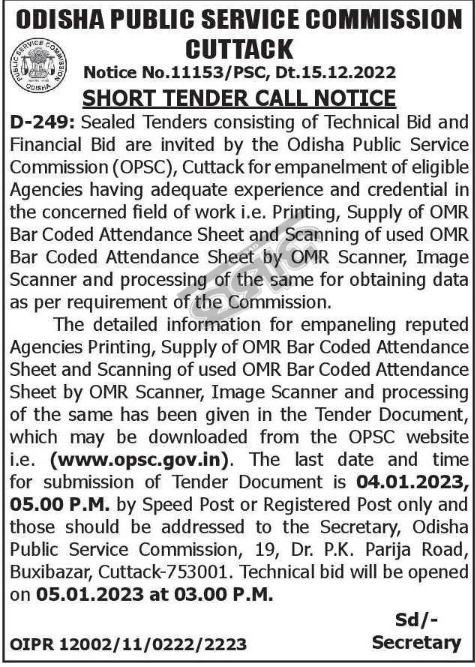 Tender for Printing, Supply of OMR Bar Coded Attendance Sheet and Scanning of used OMR Bar Coded Attendance Sheet by OMR Scanner, Image Scanner and processing of the same for obtaining data as per requirement of the Commission.
