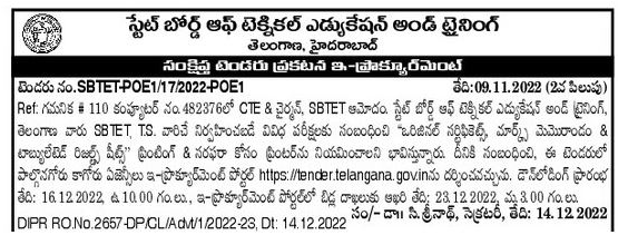State Board of Technical Education and Training, Telangana SBTET, TS. Printer is expected to be appointed for printing & supply of Original Certificates, Marks Memorandum & Tabulated Result Sheets” for various examinations conducted by them.