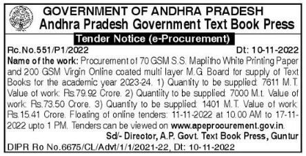Tender for Procurement of 70 GSM S S. Maplitho White Printing Paper and 200 GSM Virgin Online coated multi layer M.G Board for supply of Text Books for the academic year 2023-24.
