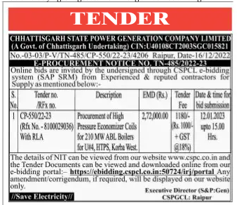 Tender for Procurement of High Pressure Economizer Coils for 210 MW ABL Boilers for U#4, HTPS, Korba West.