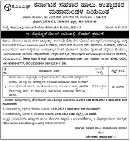 Tender for project for Hassan Milk Union. Capacity Effluent treatment plant works related to civil, supply of machinery and related works to be executed on turn key basis – Hassan