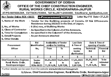 Tender for projects of Constn. Of R.L Office-cum- Residence during 2022-23 in the Dist. of Jajpur. 2. No. of Works : 6 (Six) nos, of Building Works