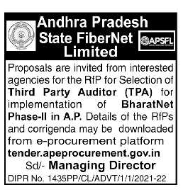Tender for Proposals are invited from interested agencies for the RfP for Selection of Third Party Auditor (TPA) for implementation of BharatNet Phase-II in A.P.