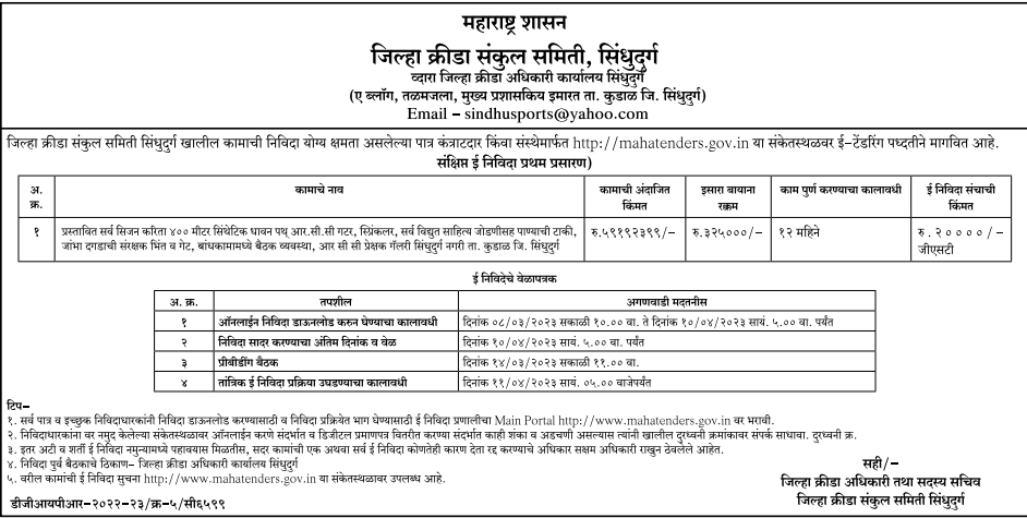 Tender for Proposed 400 m synthetic running track for all season r. C. C gutters, sprinklers, water tank with all electrical connections, Jambha stone protective wall and gate, meeting arrangement in the construction, RCC Spectator Gallery Sindhudurg City. Kudal District Sindhudurg