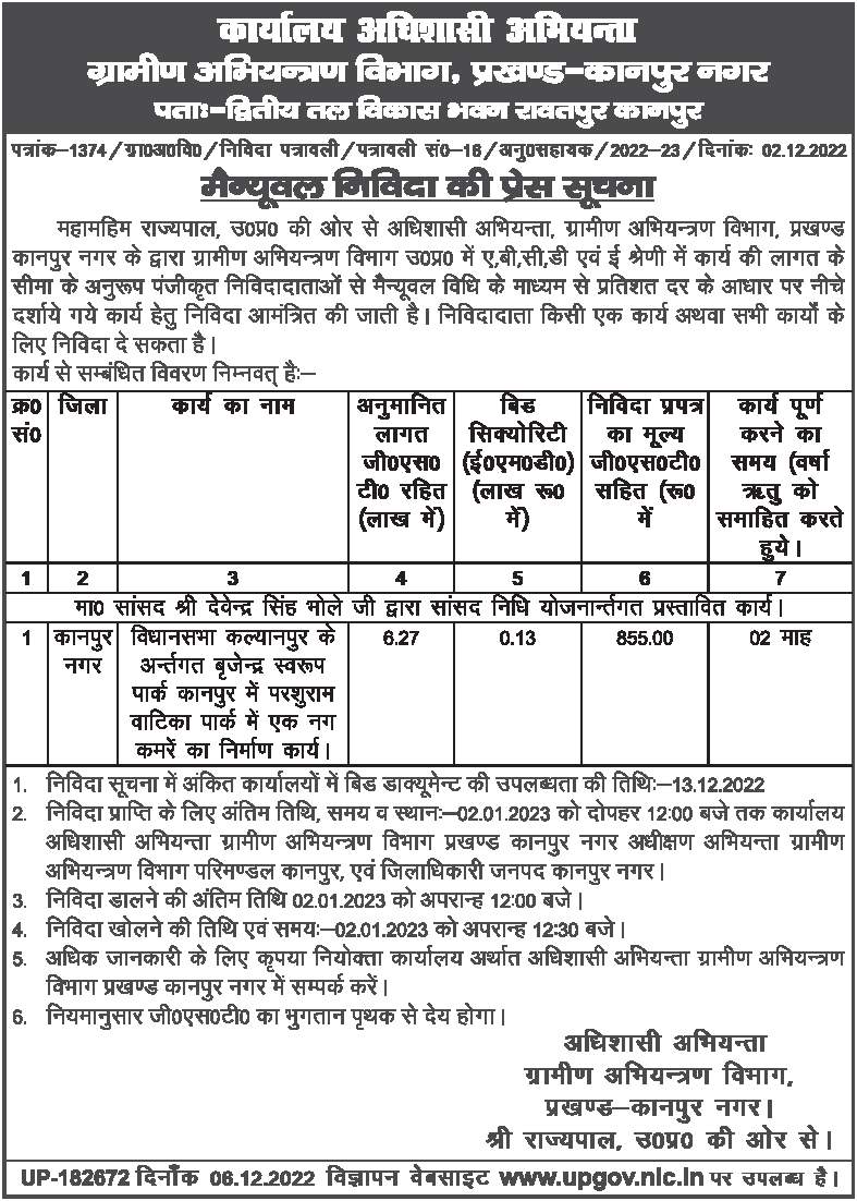 Tender for Proposed by Hon’ble MP Shri Devendra Singh Bhole under MP Fund Scheme 1 Kanpur Nagar Construction work of one nug room in Parshuram Vatika Park in Brijendra Swaroop Park Kanpur under Vidhansabha Kalyanpur.