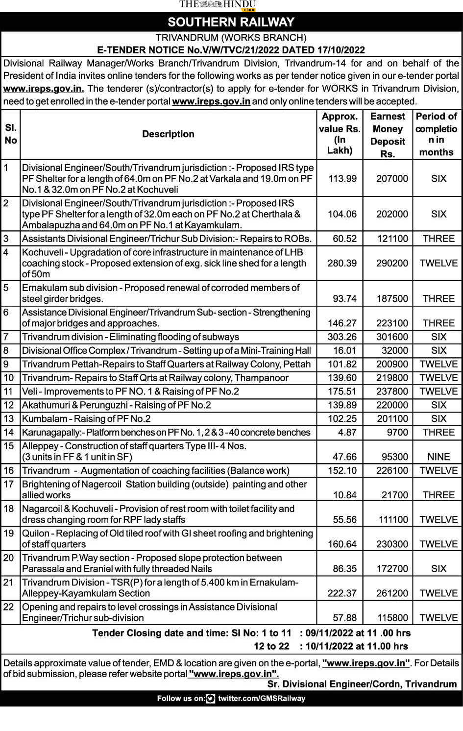 Divisional Engineer/South/Trivandrum jurisdiction:- Proposed IRS type PF Shelter for a length of 64.0m on PF No.2 at Varkala and 19.0m on PF No.1 & 32.0m on PF No.2 at Kochuveli